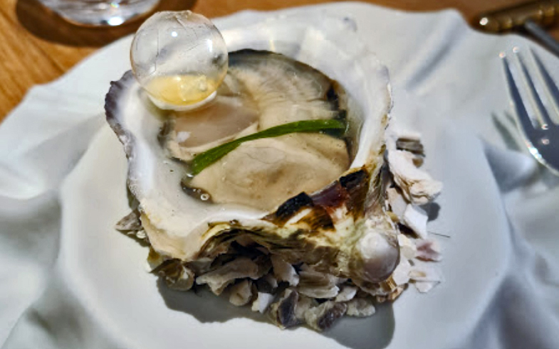 Une très grosse huitre et sa "Perle" que nous cassons à l'aide d'un petit maillet. En se brisant la perle dégage une petite fumée au parfum de bois de hêtre. Un régal !
